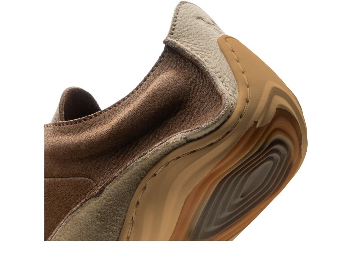 Zvršok je tiež perforovaný pre lepšiu priedušnosť, čo dokonale dopĺňa prirodzené vlastnosti kože. Vzor podrážky vzdáva hold prvému zaznamenanému odtlačku ľudskej nohy. Kráčajte spolu s týmto modelom s jedinečným dizajnom po stopách našich predkov.